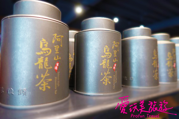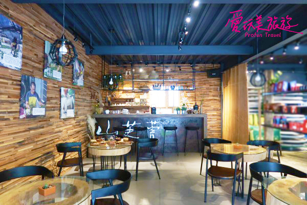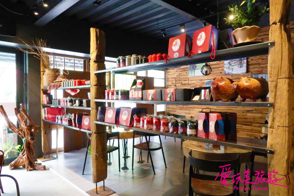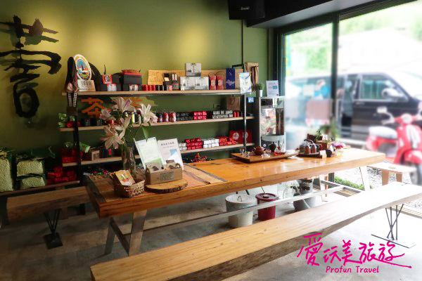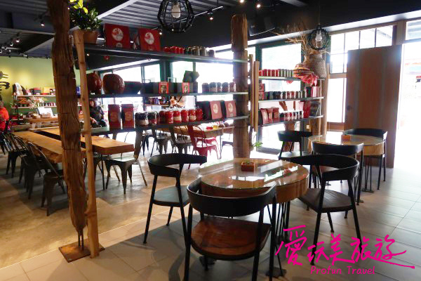 中間穿透感十足的層架擺滿了山芙蓉的自有品牌茶業系列商品