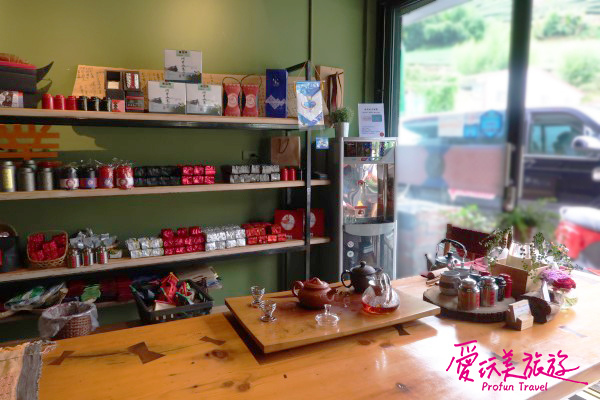 中間則用了置物層架作為隔間,上面擺放了山芙蓉自製的茶系列商品